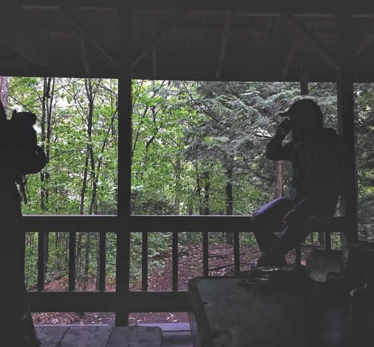 Wes enjoying a cup of coffee on the deck of our shelter after a day of hiking in the rain.
